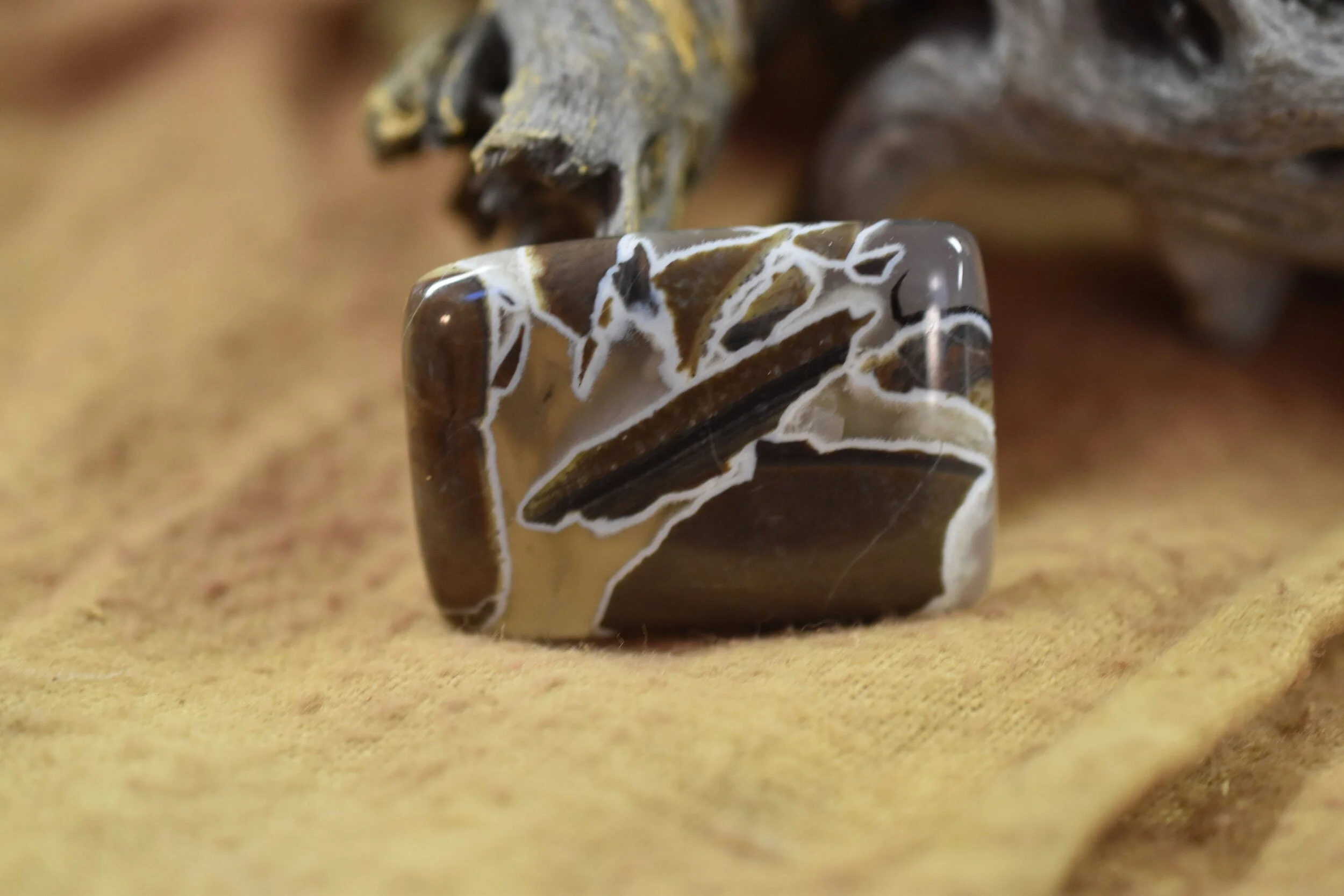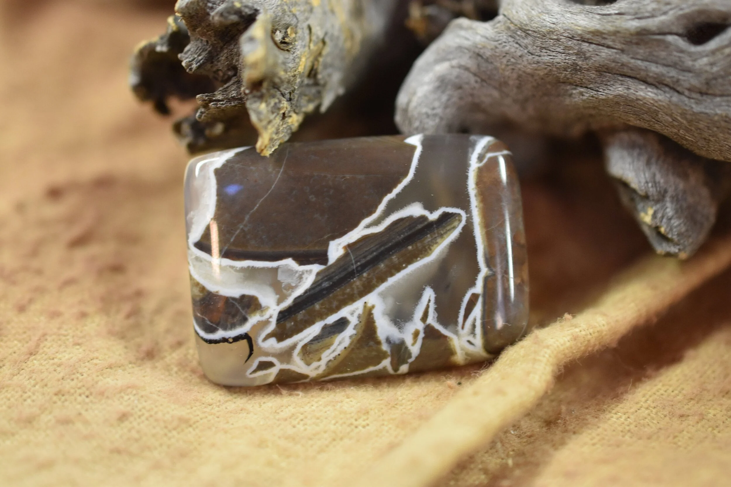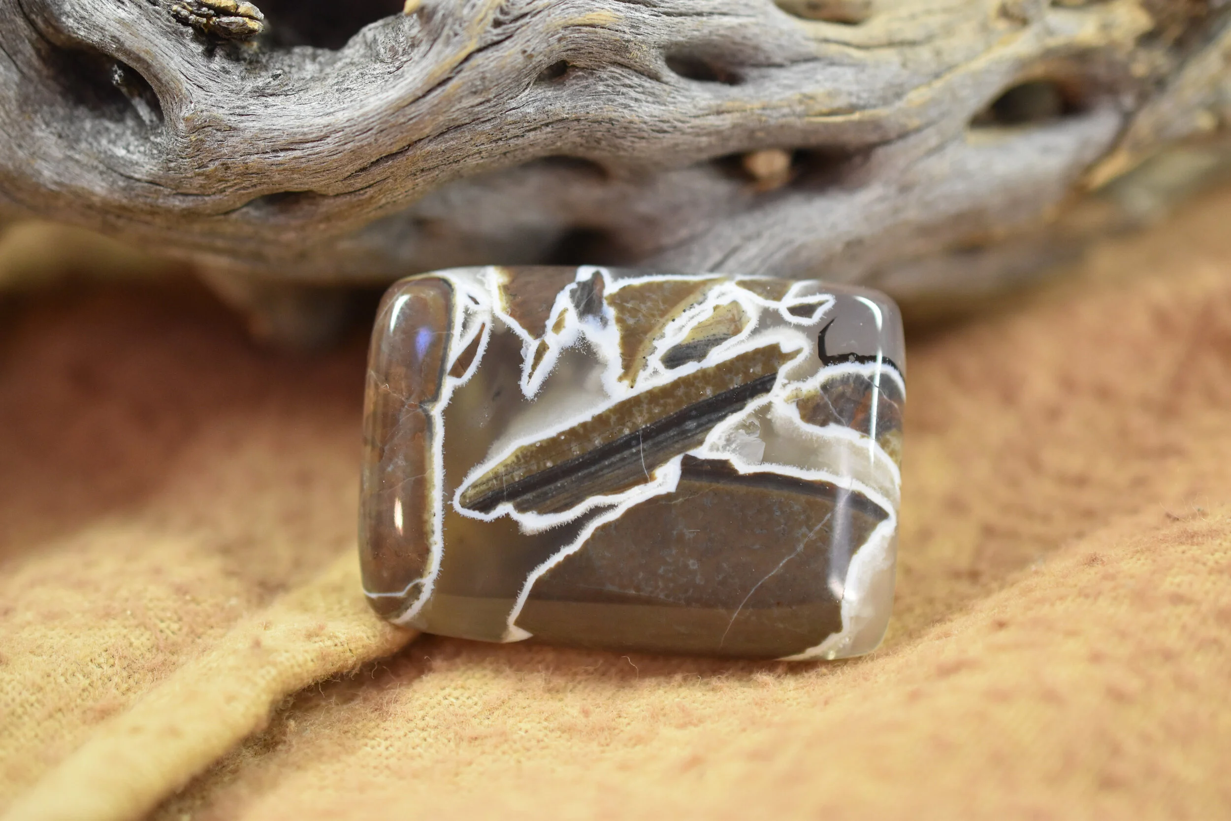 This gorgeous piece of Brecciated Jasper Agate was so stunning, we had to name it. "Feather in the stream" fit quite well, we think. This piece would make a beautiful pendant for a necklace or bracelet.