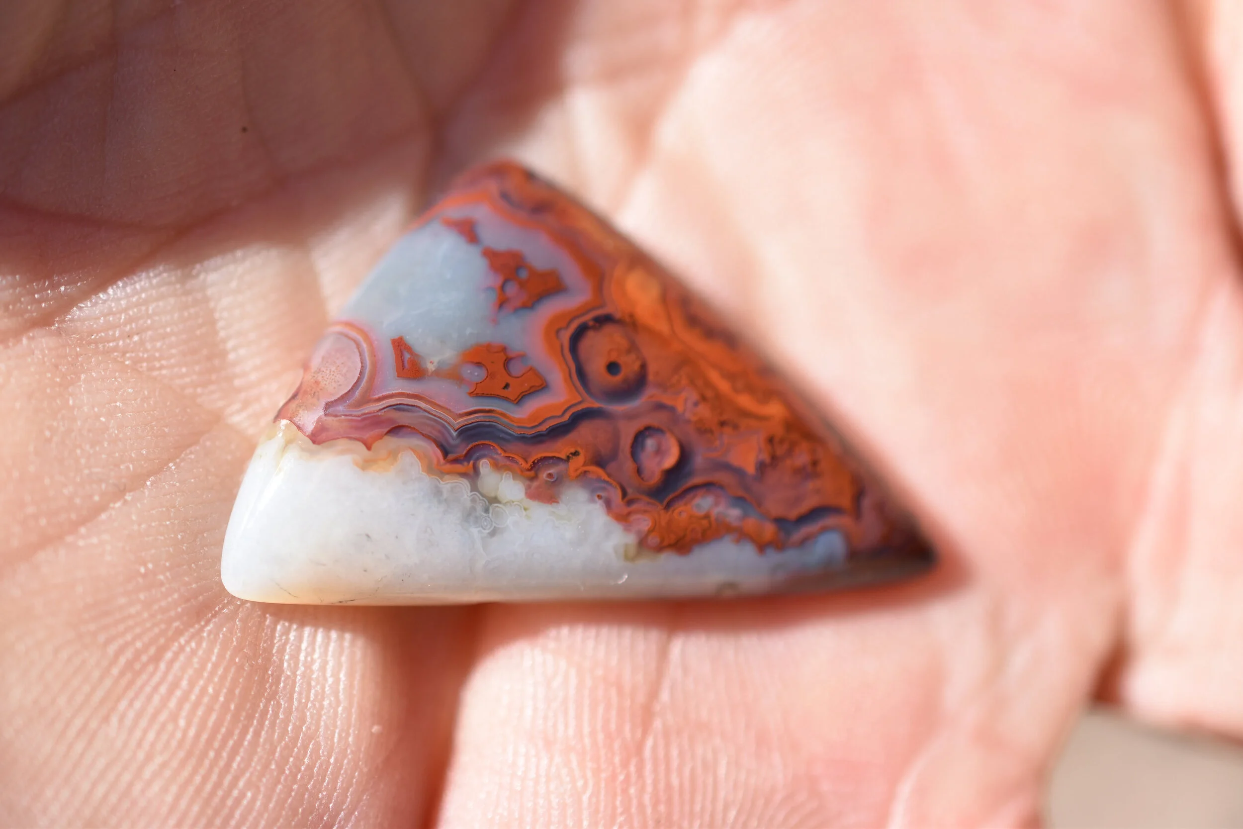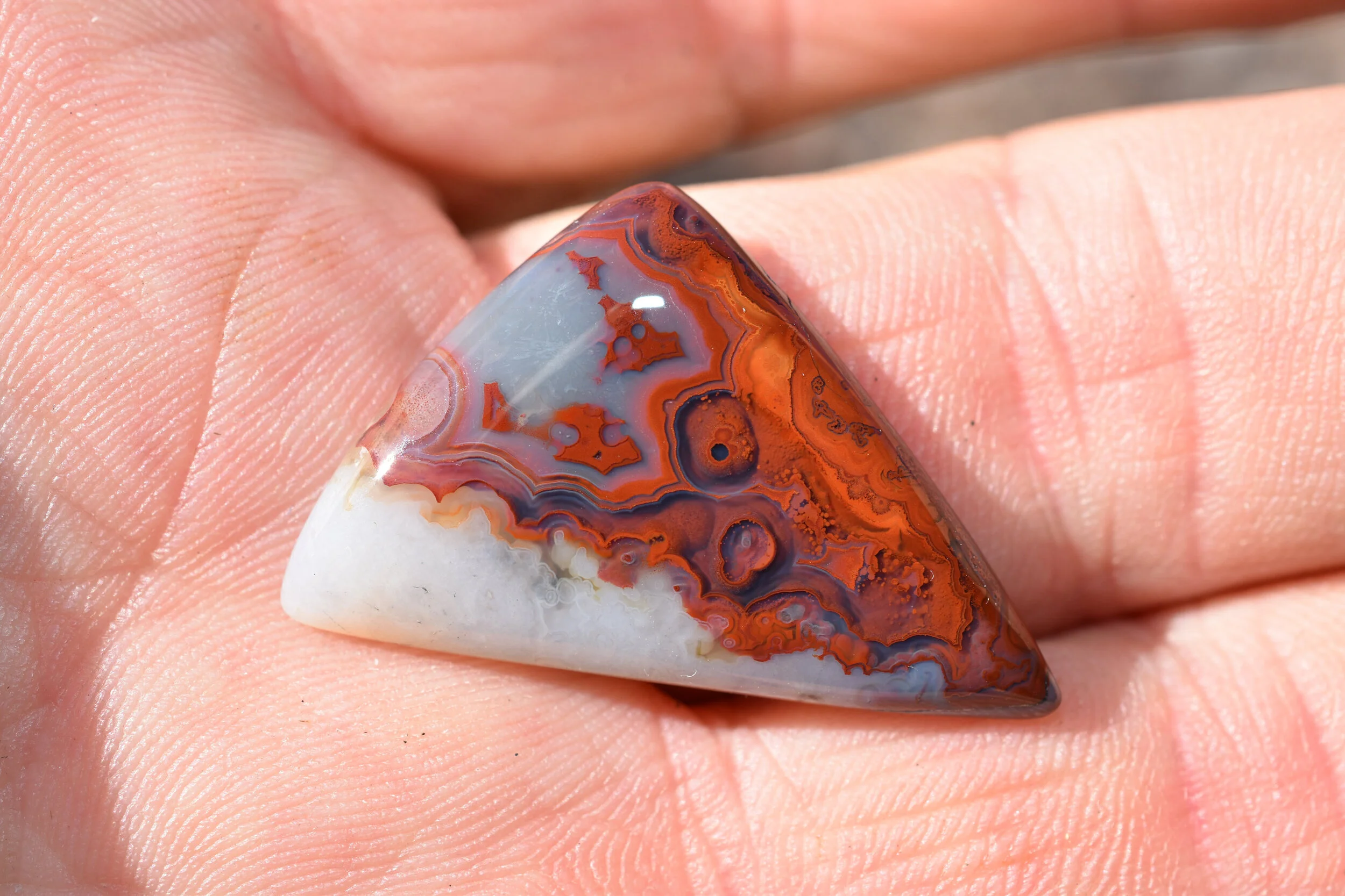 Petite cabochon of Crazy Lace Agate from Mexico. The colors in this stone pop, bright reds and oranges. This piece has so much character, it would make a stunning bracelet or pendant on a necklace.