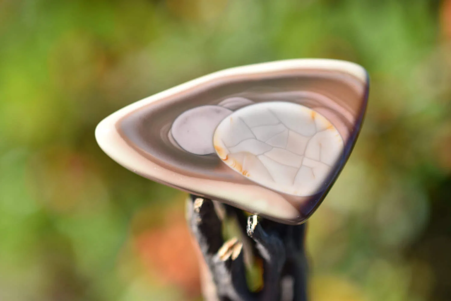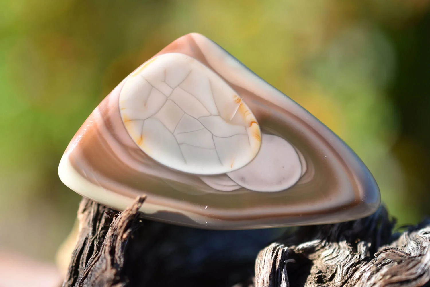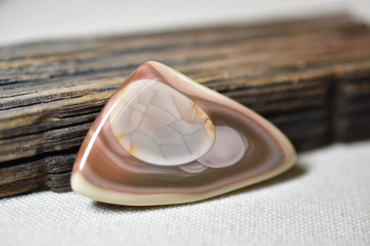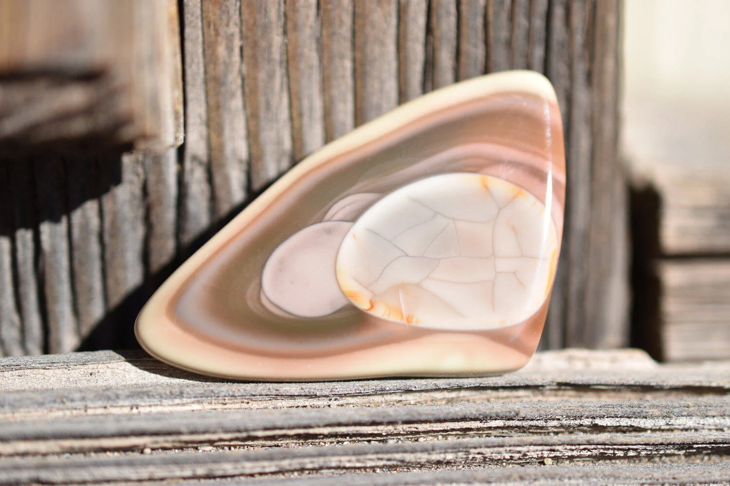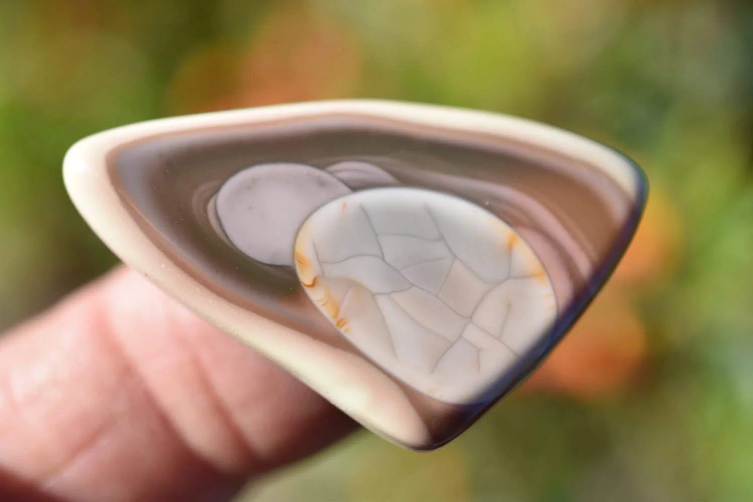 Free form piece of Imperial Jasper from Mexico. The design of this stone is just amazing with the orbs and bands. The colors range from off white to light purple to dark purple. Polished on all sides, this piece would be great as a brooch or pendant for a necklace using wire wrapping, bezel or prong set.